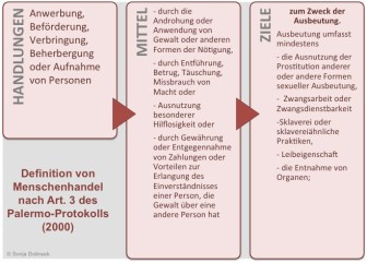 Zu Menschenhandel gehören demnach drei Elemente: die Handlung, die Mittel und das Ziel.