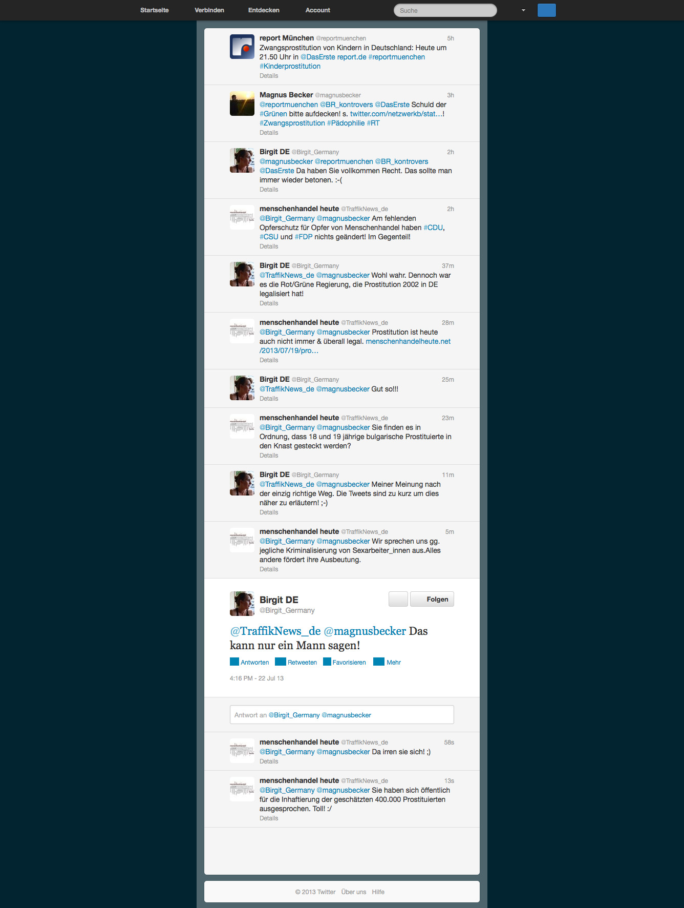 „in Augbsurg wurde zum Schutz der Frauen die Strassenprostitution verboten. Jetzt ist der BT gefragt!“ (vollständige Unterhaltung auf Twitter)